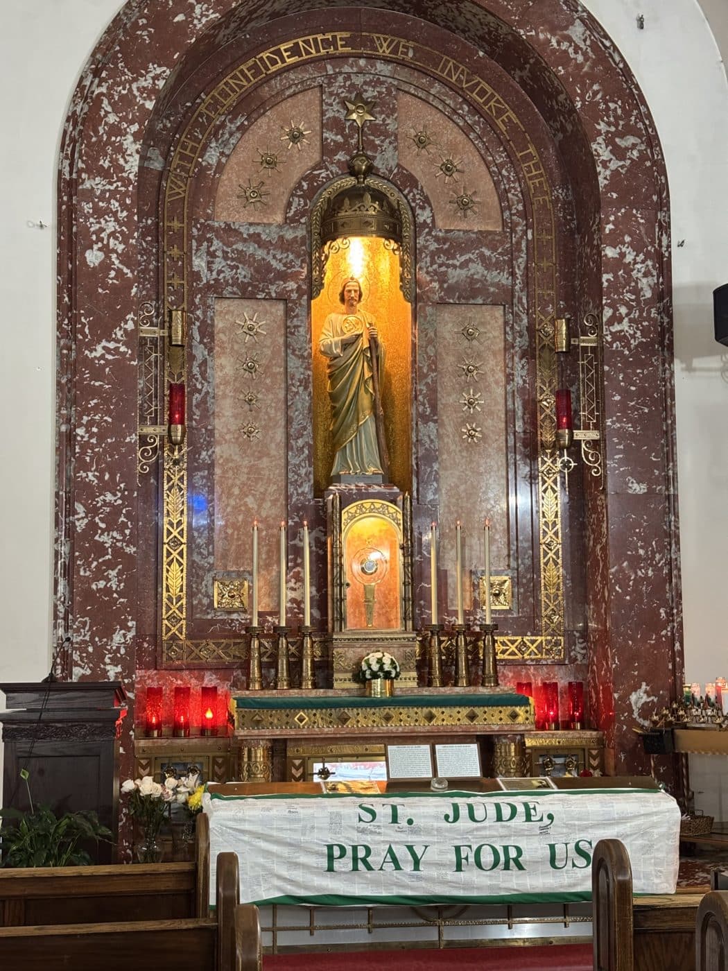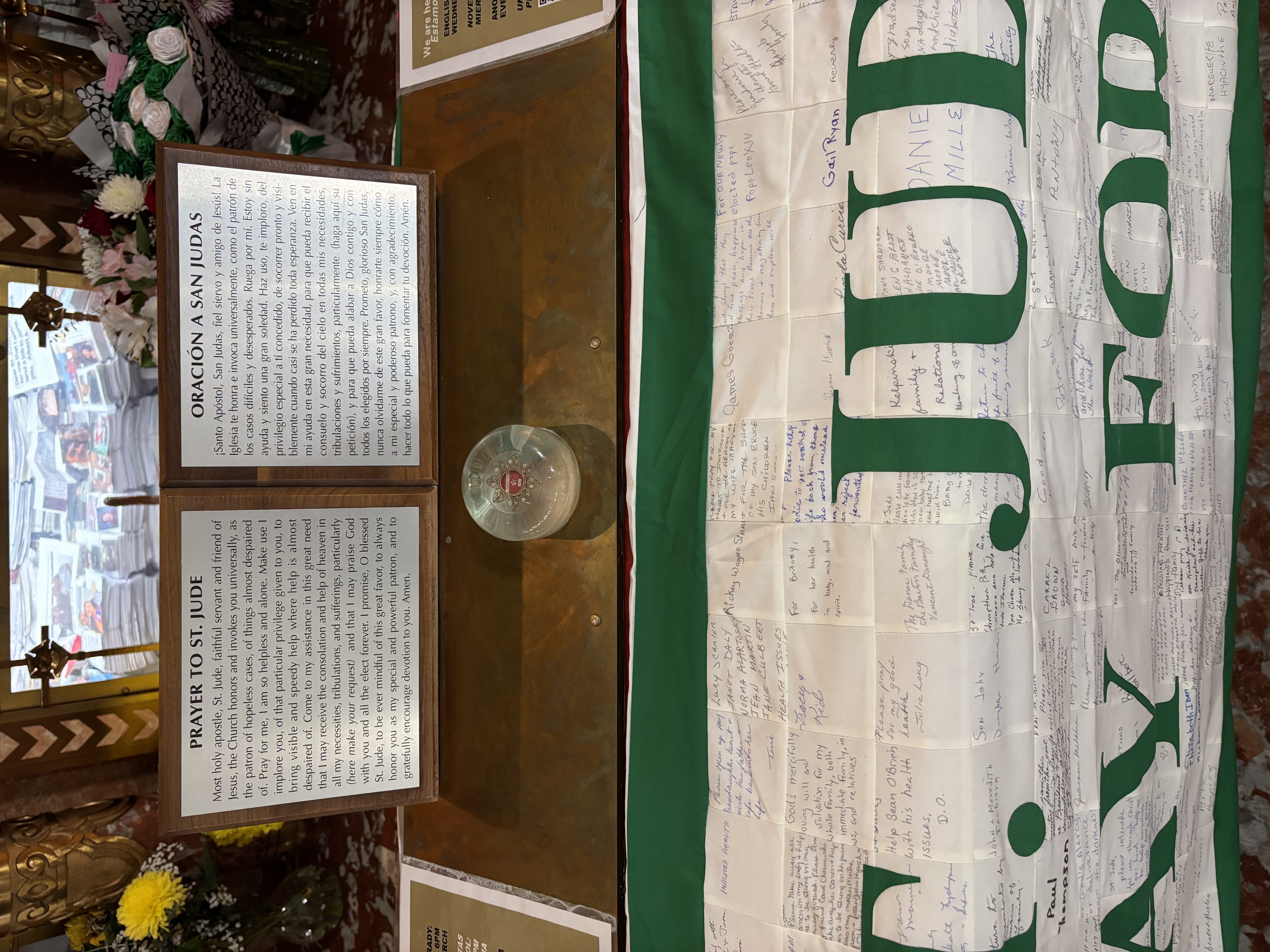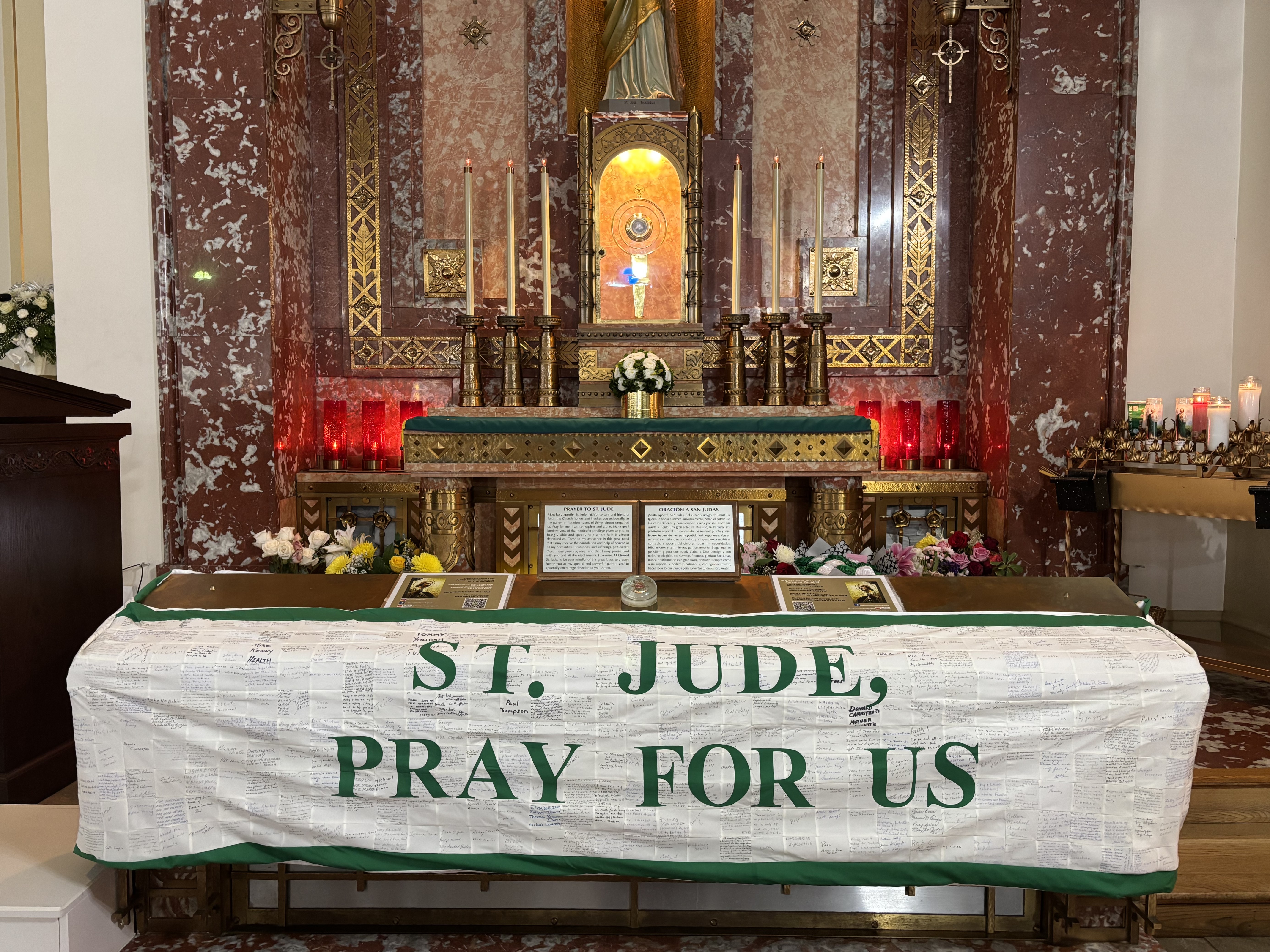 The banner is placed on the altar of St. Jude at the National Shrine to offer thanksgiving to St. Jude throughout the Solemn Novena for All Souls, October 20th – 28th, ending with the Feast of St. Jude on Tuesday, October 28th. The St. Jude Prayer Banner serves as a testament of hope, uniting all of our hearts, minds, and prayers in devotion to St. Jude.