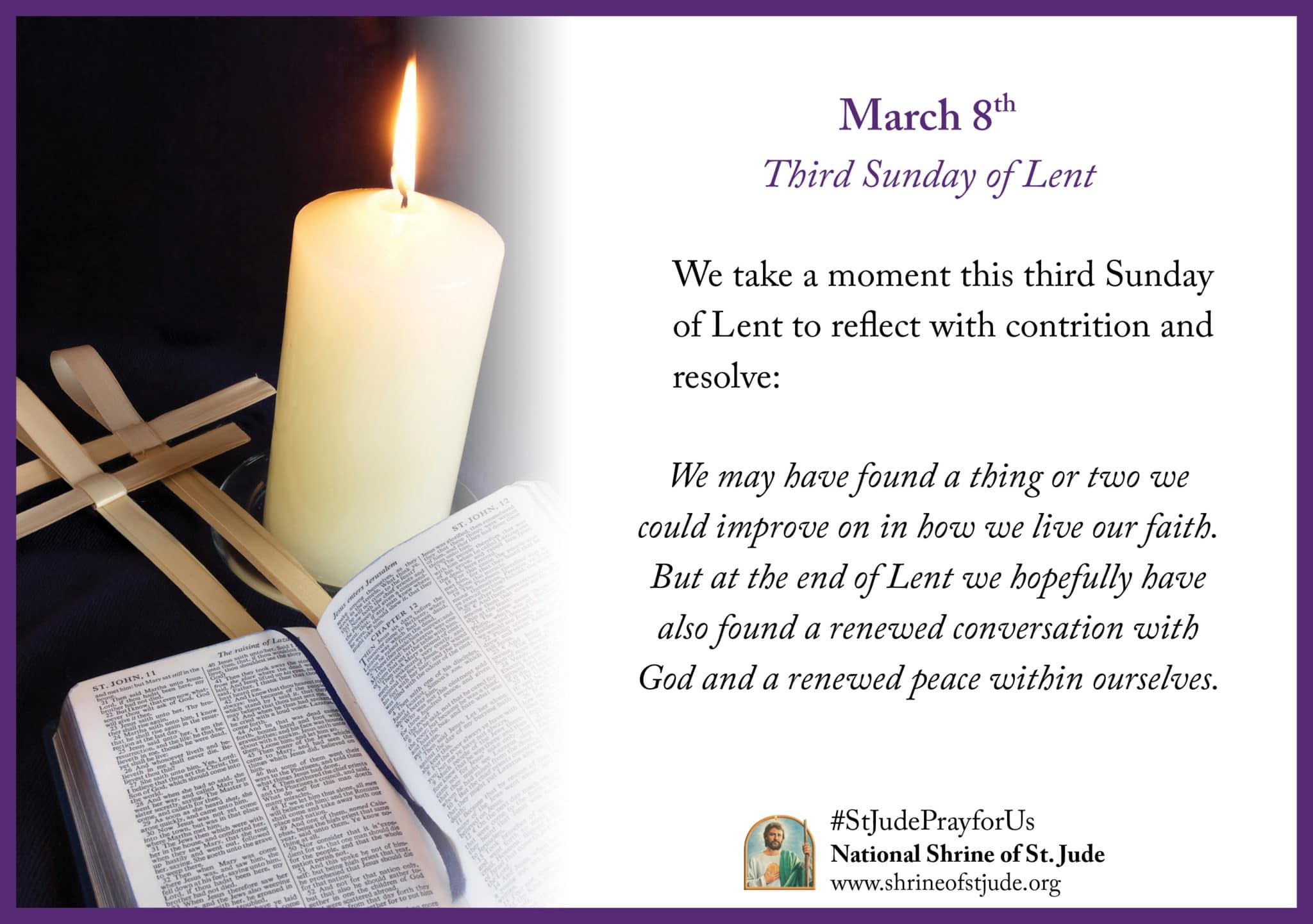 Thank you for joining us in prayer during Lent. Lent is a season of hope and renewal. In addition to our devotion to St. Jude, we can ask for guidance to keep our faith focused and strong. Each day of Lent is meaningful because we have the opportunity to turn our attention again and again to core aspects of our faith: love, charity, and prayer. As you read and consider these Lenten Meditations, know that our shared prayer and devotion to the patron of hope can enrich your Lenten journey. May the grace of God be with you during this season of renewal, in anticipation of the joy of Easter.